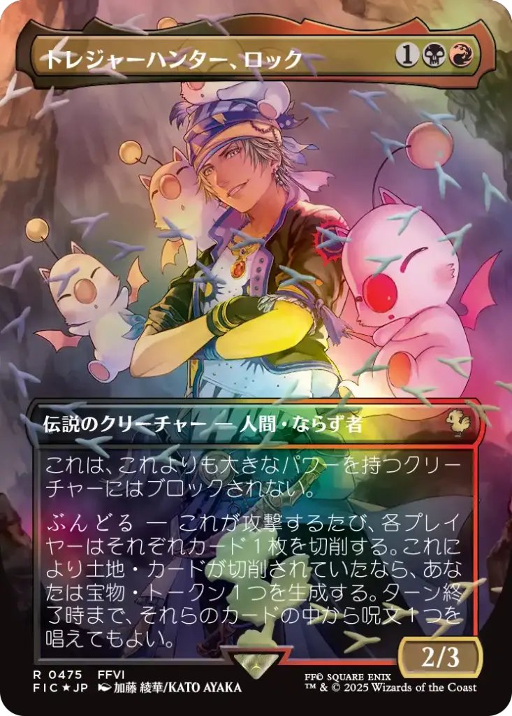 | 内容 | ●『マジック:ザ・ギャザリング――FINAL FANTASY』プレイ・ブースター 10パック ●「FINAL FANTASYの名所」フルアート版基本土地 32枚 ・非フォイル仕様の「FINAL FANTASYの名所」フルアート版基本土地 16枚 ・フォイル仕様の「FINAL FANTASYの名所」フルアート版基本土地 16枚 ●チョコボトラック・フォイル仕様の基本土地 10枚 ・チョコボトラック・フォイル仕様のボーダーレス版チョコボ・バンドル・カード’ 2枚(全20種類) ●フォイル仕様のプロモカード 1枚 ・《楽園チョコボ》(《極楽鳥》) ●非フォイル仕様の『マジック:ザ・ギャザリング——FINAL FANTASY』シーン・ボックス収録カード 1枚(全24種類) ●チョコボテーマのクリック式ライフホイール 1個 |