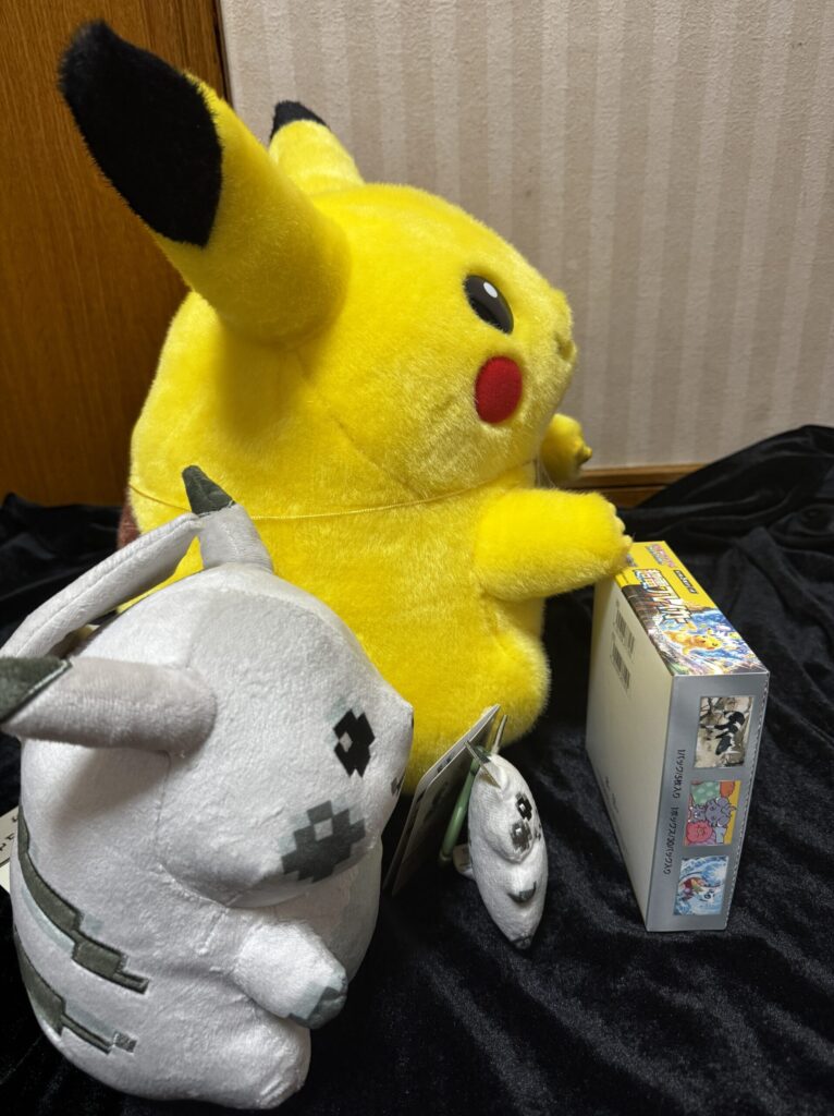 「おかえりピカチュウ」「はじまりのピカチュウ ぬいぐるみ」「はじまりのピカチュウ マスコット」のサイズ感を「ポケモンカードのボックス」と比較してみました!