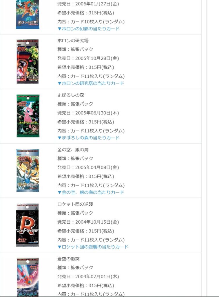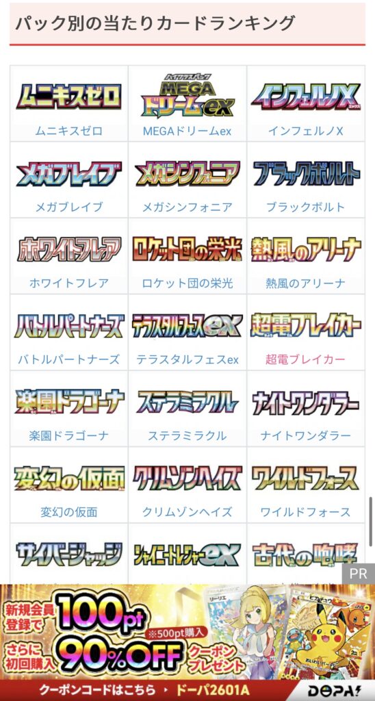 過去に発売されたパックから最新・今後発売予定のパックまで一覧で確認できる点も、ポケカチの魅力です。