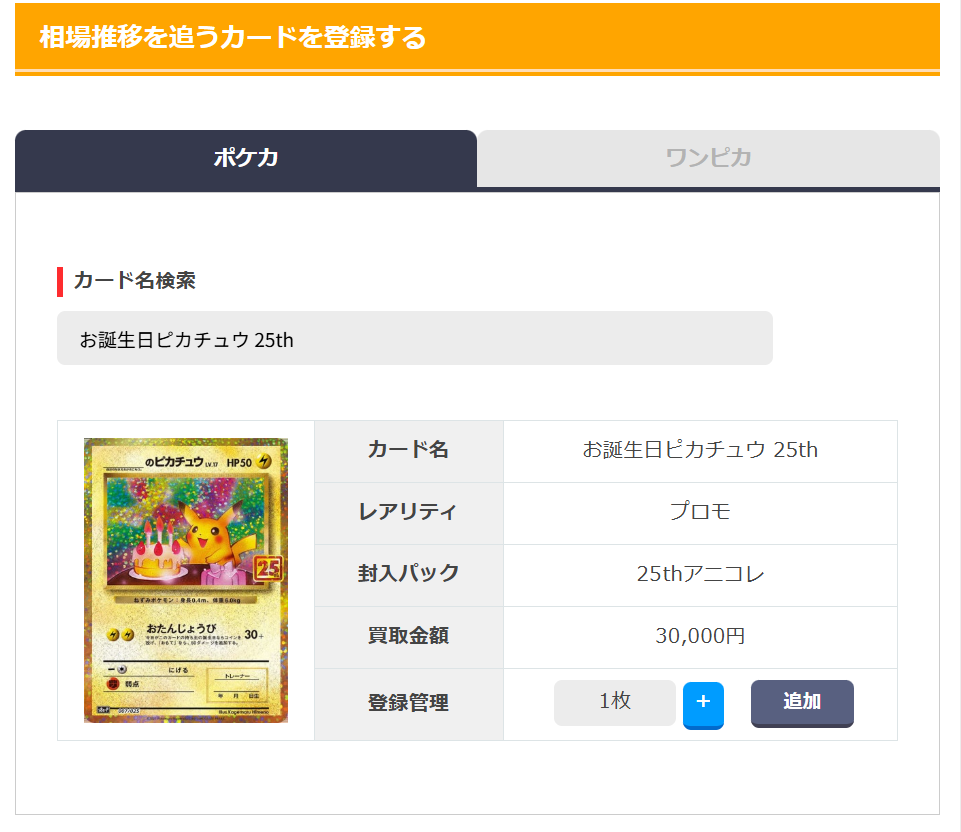 自分の所持しているカードや、相場を追いたいカードを「カード名検索」から検索して、登録します。