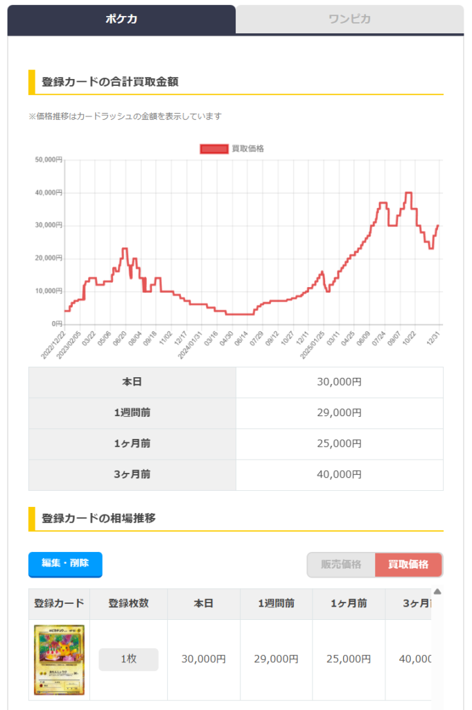 - 所持カードを登録することで、コレクション全体の合計相場を確認できる